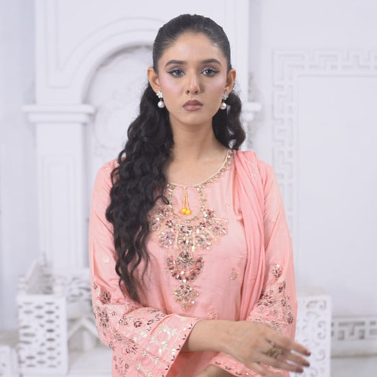 Turn heads with this graceful dark pink unstitched suit, exquisitely crafted from premium lawn. Adorned with thread embroidery, sequins, mirror work, and a handmade neckline, it radiates festive charm. The set includes a heavily embroidered shirt, comfortable trousers, and a Bamber dupatta with elegant 2-side pallu. Whether for festive moments, casual elegance, or semi-formal gatherings — this ensemble is your go-to.