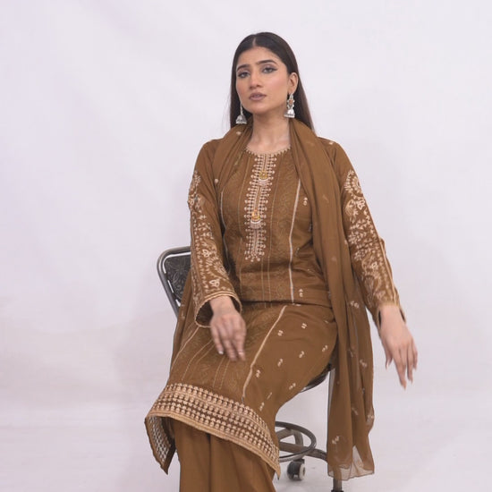 Elevate your festive look with this elegant rust-colored 3-piece unstitched suit featuring an embroidered shirt and sleeves, paired with matching trousers and a bamber embroidered dupatta. Perfect for semi-formal and festive occasions.
