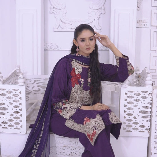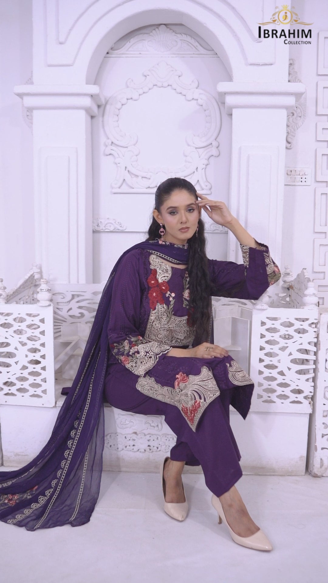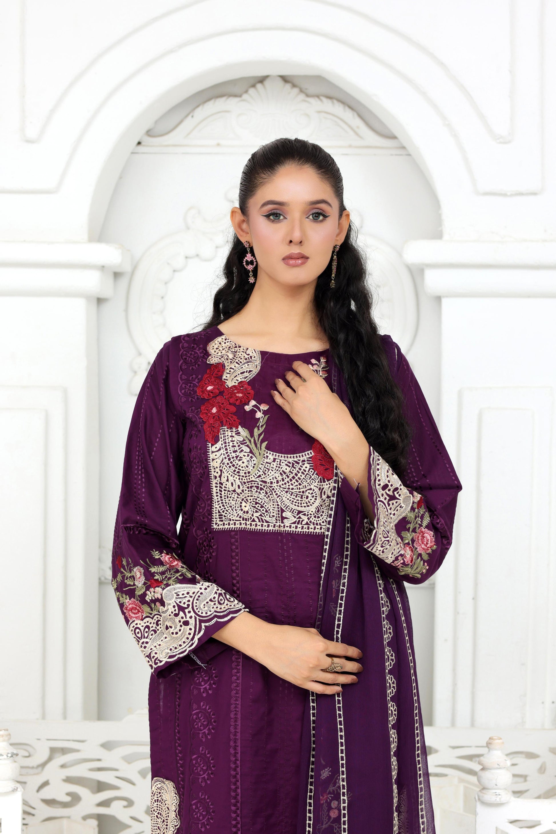 Step into timeless elegance with this premium 3-piece unstitched suit, featuring heavily embroidered shirt, full Bamber embroidered dupatta, and regular-fit trousers. Delicate white and red threadwork adds charm to this stunning ensemble — perfect for festive, casual, or semi-formal occasions.