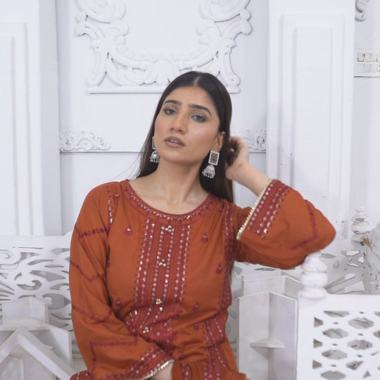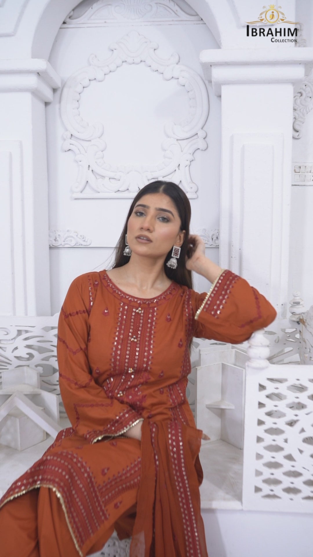 Elevate your festive look with this elegant rust-colored 3-piece unstitched suit featuring a sequin-embroidered shirt and sleeves, paired with matching trousers and a Bamber dupatta with sequin spray and embroidered borders. Perfect for semi-formal and festive occasions.
